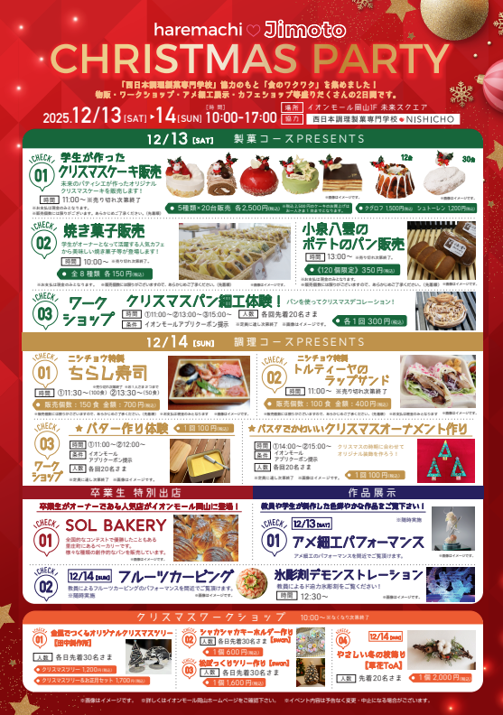 西日本調理製菓専門学校は、12月13日(土)、14日(日)10:00~17:00にイオンモール岡山1F未来スクエアにてクリスマス特別イベントを開催します。