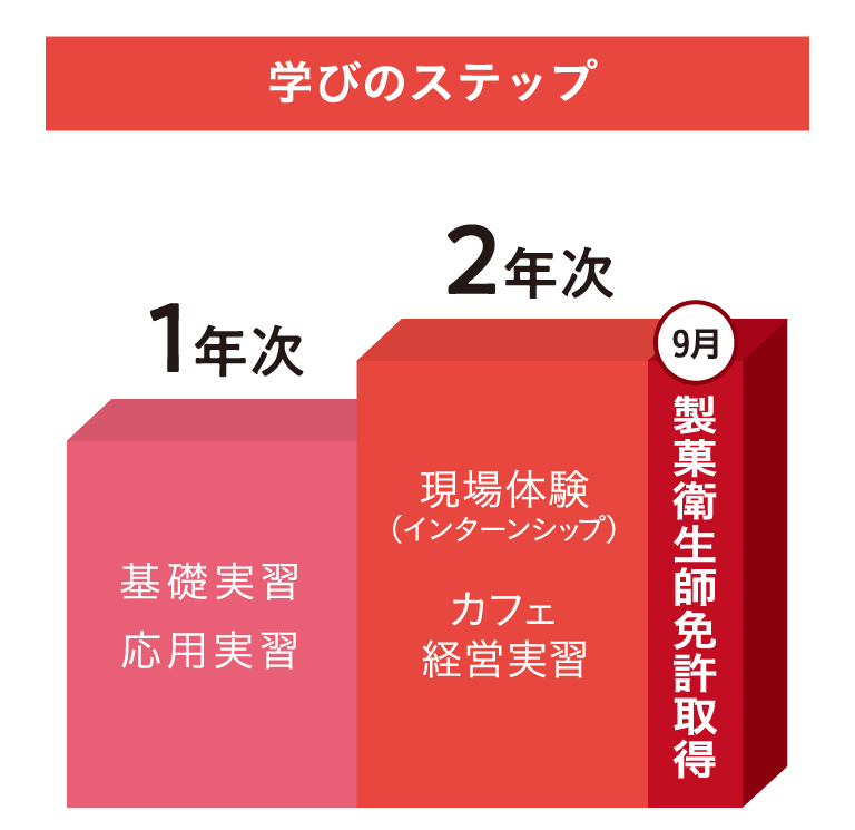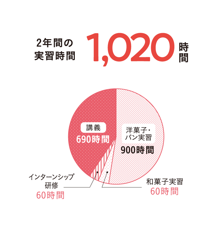 2年間の総実習時間は1,020時間以上。洋菓子・パンづくりの基礎から最新技術まで学びます。また、洋菓子とパンの専門的なテクニックに加えておもてなしの心を学び、カフェ経営実習で実践します。技術とサービス、経営の全てを体感しながら学べます。