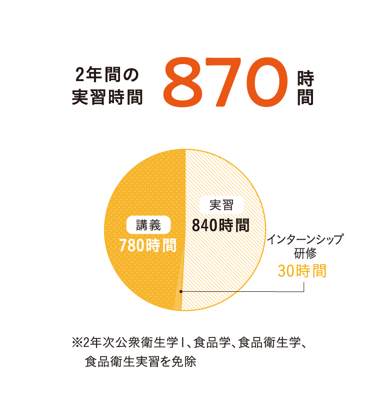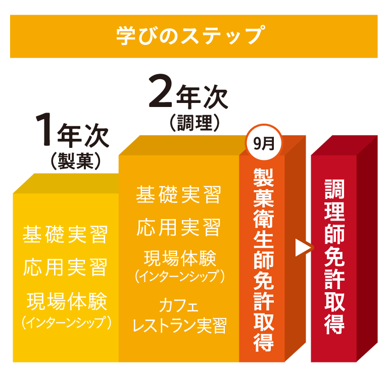 Wライセンスコース 2年|共学|40名 調理・製菓どちらのプロとしても活躍できる 知識と技術力が2年間で習得できる。 Learning points 学びのポイント 01 調理・製菓どちらのプロとしても活躍できる 知識や技術力が2年間で習得できる。 02 カフェレストラン実習で現場力や おもてなしの心を身につけ、実践力を鍛える。 03 調理と製菓を1年ずつ集中して学ぶことで、 調理師・製菓衛生師のW国家資格取得をめざせる。 Real Training Program レストラン実習 カフェレストランの運営を通して実践力を高める 実習の流れ カフェレストラン実習では、メニュー考案から提供・接客・売上管理まで行い、カフェレストラン経営に必要な知識・技術を身につけます。 さらに、調理師とお客さまの双方の視点で時間や完成度、サービスなどを厳しくチェックし改善。 現場力やおもてなしの心を身につけられます。 調理実習 西洋料理 フランス料理を中心に、スペイン料理やイタリア料理などの調理法や食材、調味料について学び、繊細な技術と高度な技術を習得します。 日本料理 食材の切り方や仕込み、だしの扱い方など日本料理の基礎から、会席料理、旬のお造り、寿司、天ぷら、すっぽん、手打ちうどん・そばなど幅広く習得します。 中国料理 食材や調味料、油などの使い方を身につけて、前菜からダイナミックなメイン料理まで学びます。 製菓-製パン実習 洋菓子 フルーツの切り方、生クリームの泡立て・ナッペ・絞りなどの基礎から、チョコレートやアメ細工、シュガークラフトなどの高度なテクニックまで実習で繰り返し身につけていきます。 和菓子 基礎であるあんづくりや、練りきりなどの技術を習得します。 製パン 小麦粉、イーストなど素材の知識とともに基礎から、各種パンの技法を習得します。 その他の実習 ・むき物 ・カービング ・総合調理実習 シェフ&パティシエ両方のプロをめざす 調理・製菓を1年ずつ学ぶことで、国家資格である調理師・製菓衛生師のWライセンス取得をめざします。さらに、日本・西洋・中国料理、洋菓子・和菓子、パンの知識と技術も習得し、カフェレストラン実習で実践。調理・製菓どちらの業界でも活躍できる食のプロをめざします。 ※スイーツ科から調理師科に進学して、+αの学びで実践力を身につけるコースです。 2年間の実習時間 注目の実習 ●カフェレストラン実習 カフェレストランの運営を通して、実践力を高めます。調理と製菓の技術を駆使したランチメニューの考案から提供、接客、売上管理まで行い、カフェレストラン経営に必要な知識・技術を身につけます。 取得可能な資格 調理師(国家試験免除)(国) 専門調理師(学科試験免除)(国) 製菓衛生師(国)☆ 全調協実技検定グレード1・2 食育インストラクター 介護食士3級 食品衛生責任者 ☆は受験資格です。 主な活躍フィールド ホテル 料亭・割烹 レストラン レストランウェディング 結婚式場 病院 幼稚園・保育園 食品メーカー 洋菓子店 和菓子店 パン工房 カフェ