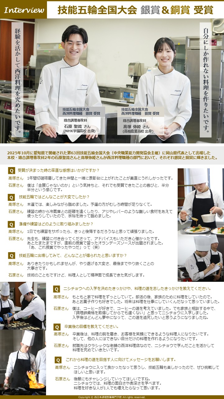 2025年度技能五輪インタビュー10月開催に愛知県で開催された第63回技能五輪全国大会(主催:中央職業能力開発協会)西洋料理職種に岡山県代表として出場した、本校・総合調理専攻科2年の石原聖流さんと高塚弥姫さんが、それぞれ銀賞と銅賞を受賞しました。